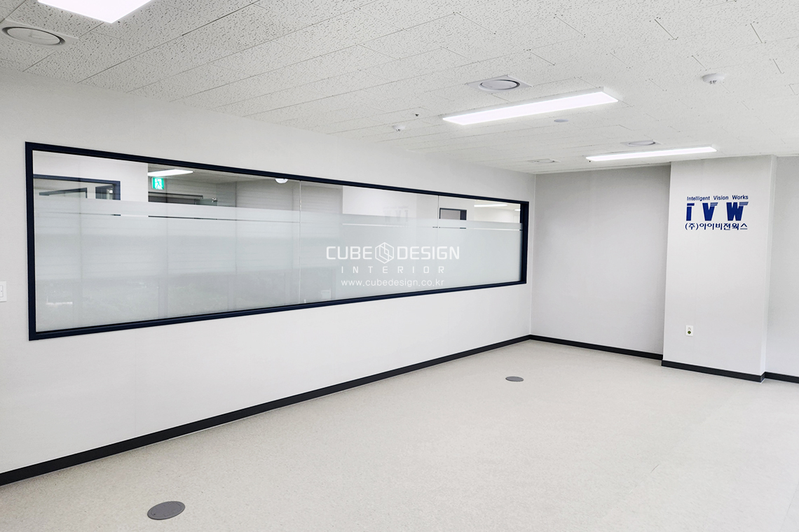 회의실은 답답하지않게 반창을 활용하여 개방감을 주고 시선을 차단하기위해 안개시트를 시공하여 마감하였습니다.