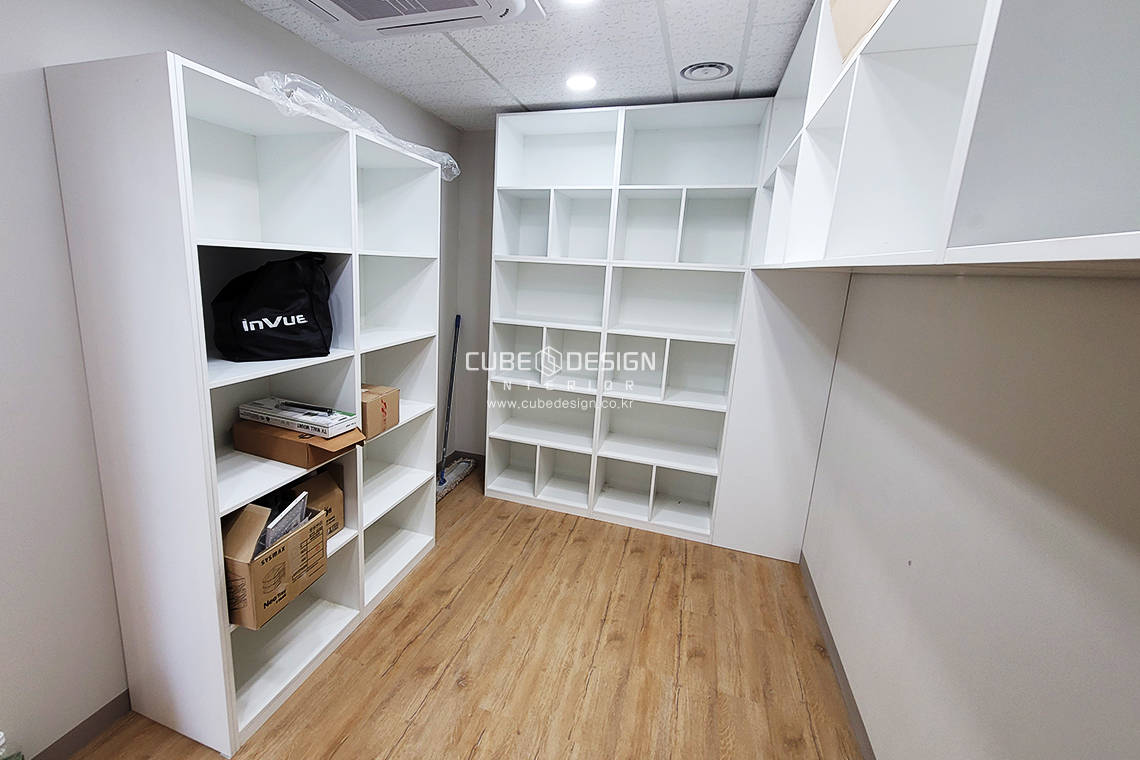 창고공간에는 화이트와 무늬목 필름으로 공사가 완료되었습니다.