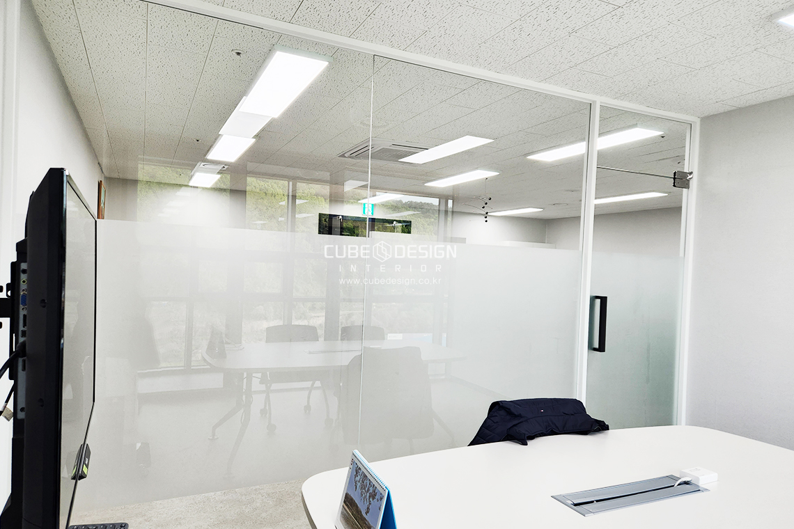 아연도금강판을 가공하여 유리틀을세운뒤 대표실과 회의실을 나누어 공간을 활용하여주고