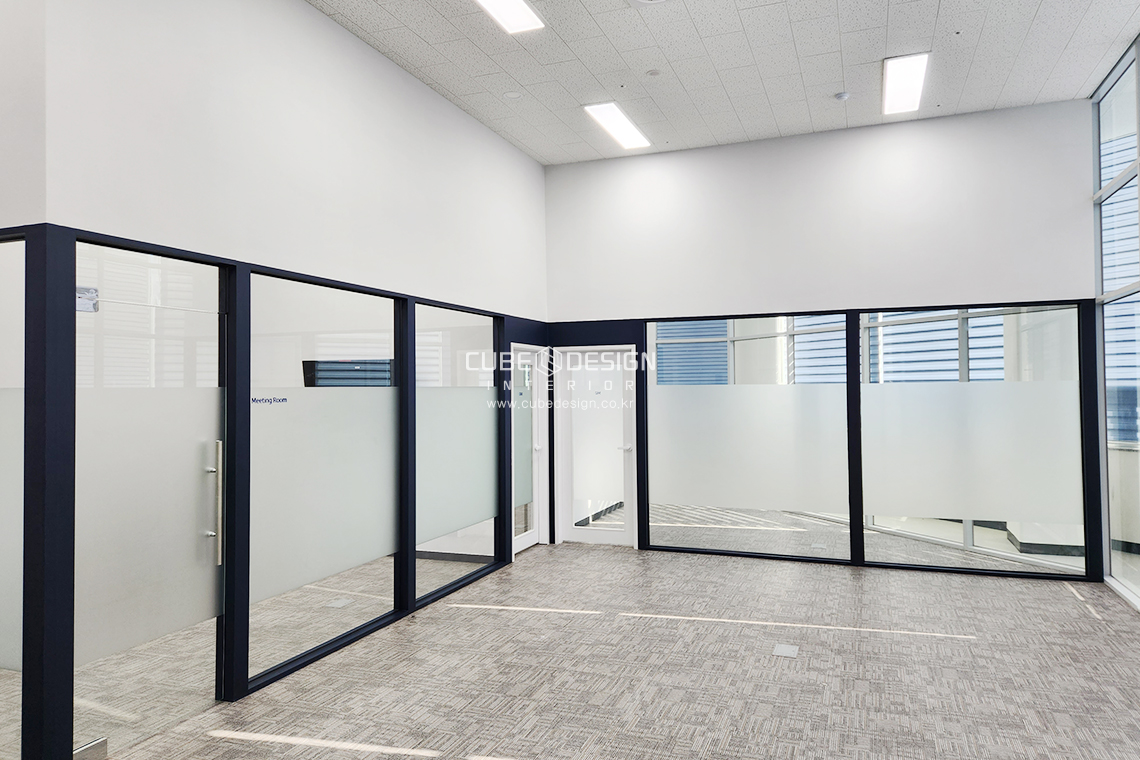 층고가 높기때문에 하단부에는 유리를 ,상부에는 석고와 합지로 마감하였습니다.
