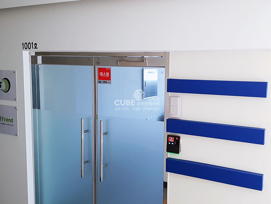 외부아트월은 최개한 간단히 포인트만 주어 디자인하였고, 강화유리도어를 설치한뒤에 안개시트를발라 마감하였습니다.