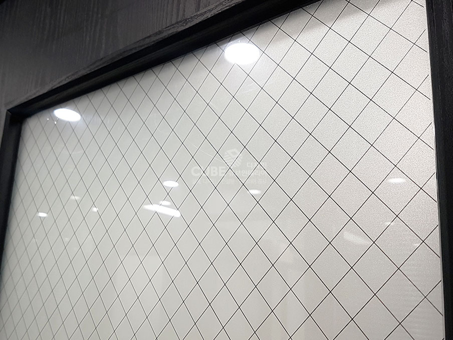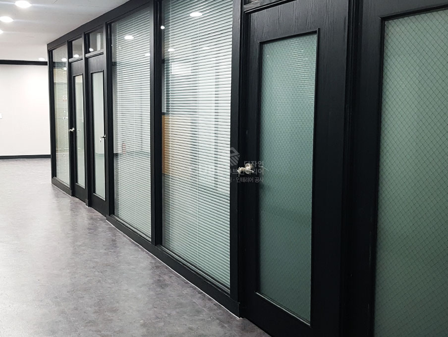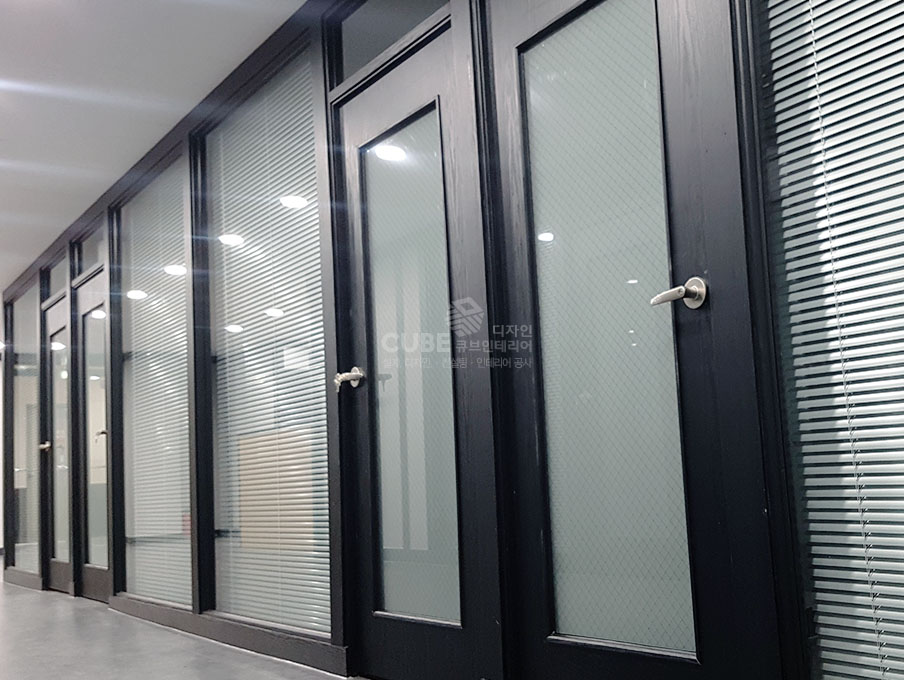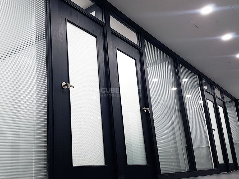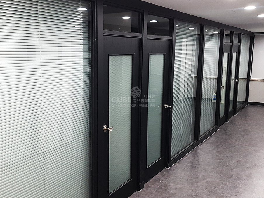 화이트색상의 래핑칸막이와 블랙계열의 유리틀&몰딩 도어의 조합은 법률사무소 인테리어에 가장 잘 어울리는 조합이라 생각됩니다. 유리래핑칸막이와 유리도어는 알루미늄 블라인드나 우드블라인드를 추천해 드립니다. 외부에서는 내부가 잘 비춰지지 않으며, 고급스런 느낌으로 연출됩니다.