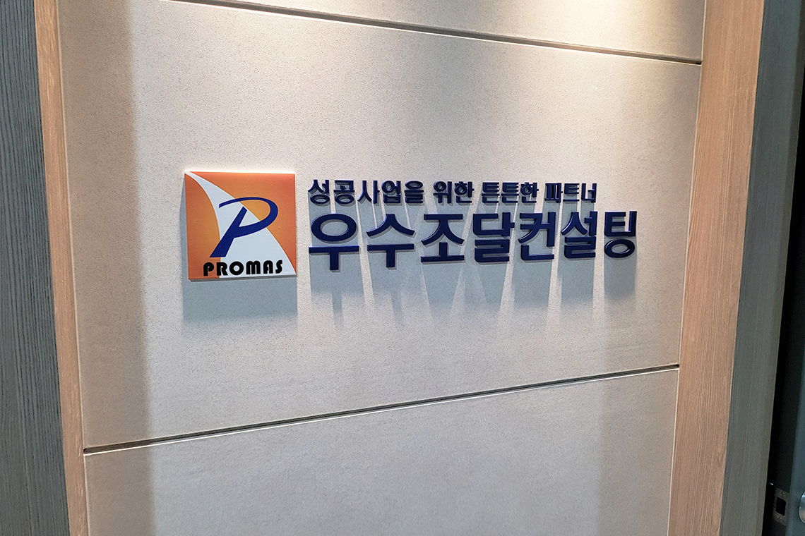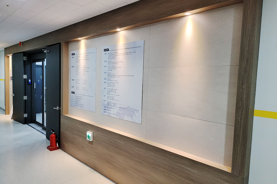 입구 회사로고와 연혁을 복도아트월로 구현하였습니다.
