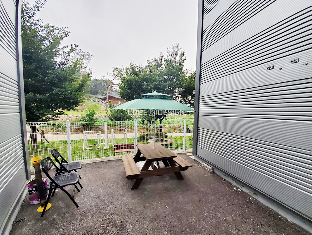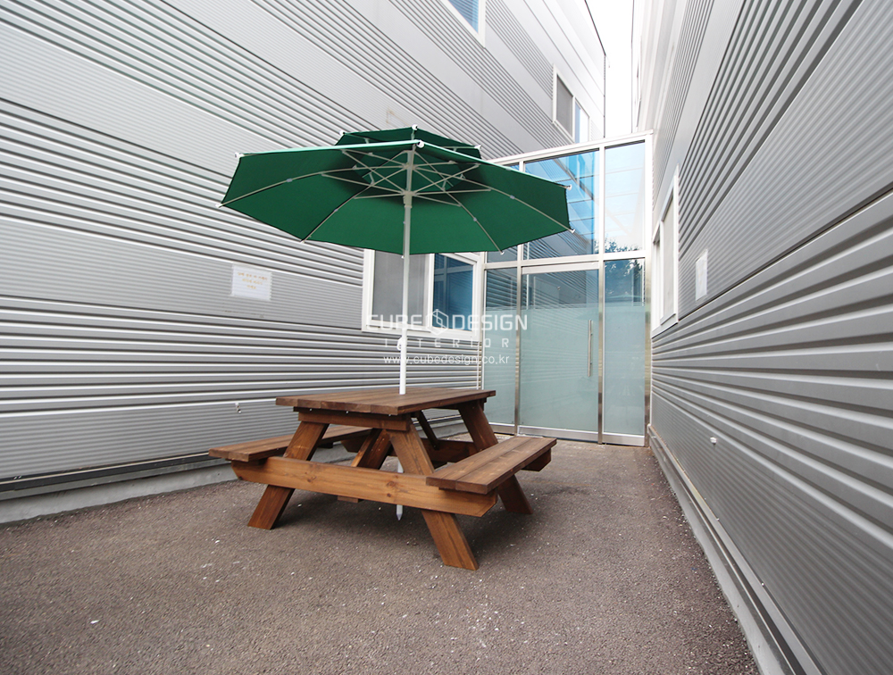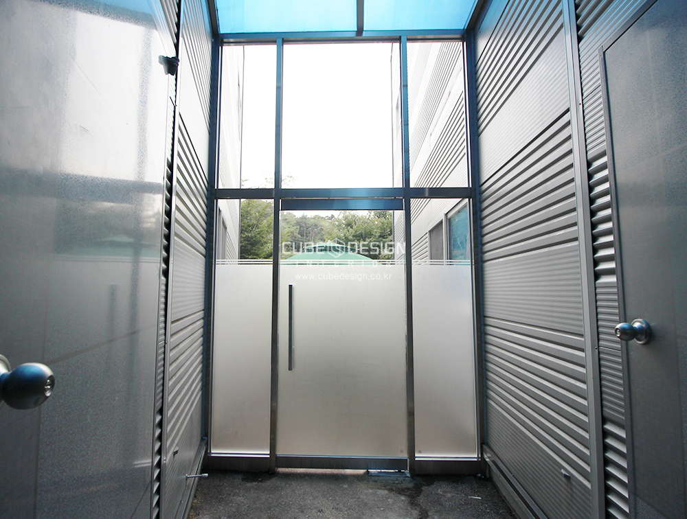 ▲ 같은 그레이 외장자재로 미닫이도어 철거부분을 금속유리칸막이로 완성 휴게실모습.
