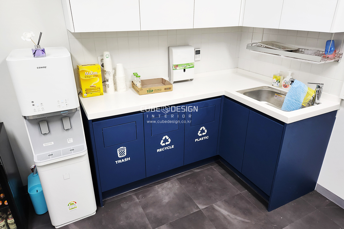 탕비실에는 맞춤 수납장을 포함하여 밝고 깔끔한 인테리어 시공