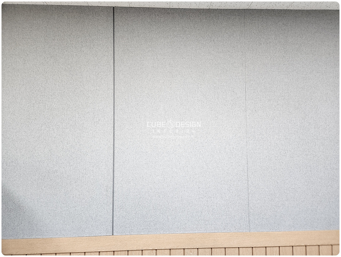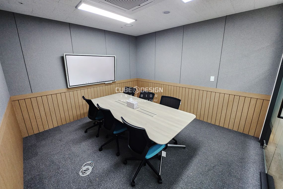 회의실에는 터치 TV를 장착할 수 있도록 합판 마감을 진행하였으며, 따뜻한 패브릭색상의 보드를 이용하여 회의에 집중할 수 있도록 설계 시공되었습니다. 붙임시공과 매지시공 2가지 사진도 같이 첨부하였어요.