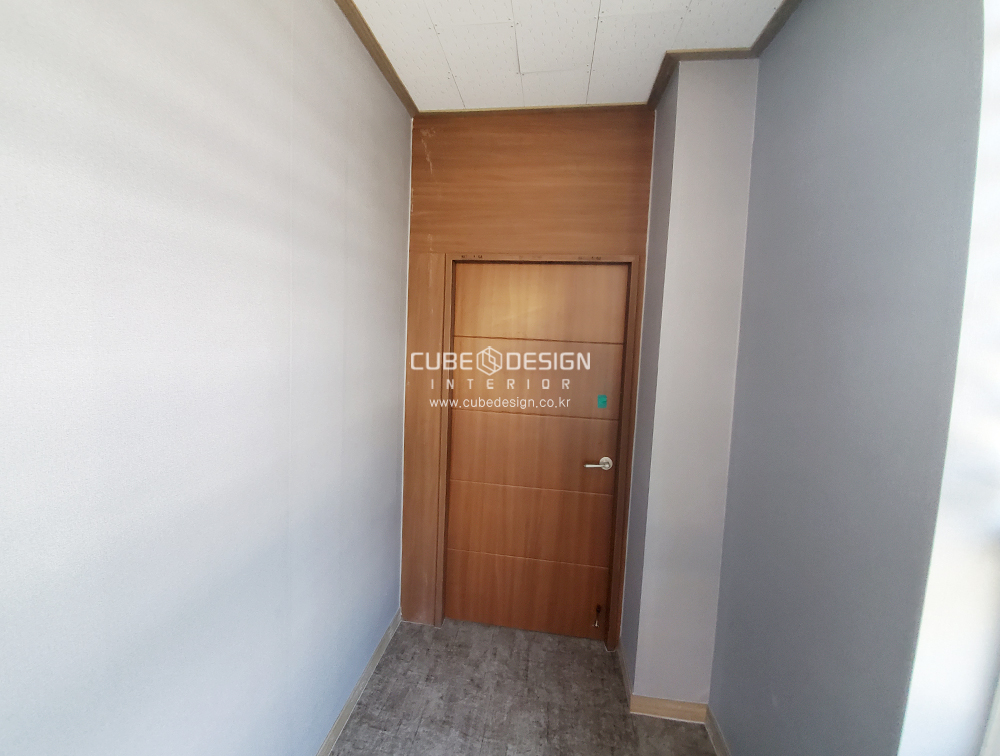 목공사를 통하여 깔끔한 외부 아트월과 강화도어로 마감된 수원인테리어입니다.
